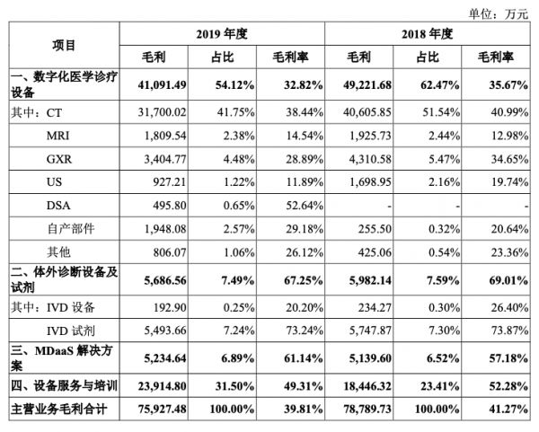 随着营收一同下降的还有毛利率。整体来看,去年东软医疗的毛利率较2018年下降了1.45%,净利润率则惨遭腰斩,从2018年的8.76%降至去年的4.29%。具体到四大业务线上,也只有MDaaS一项毛利率呈上升之态,可能是出于其此前部署的云服务等开始陆续收回成本,且商业模式正在从一次性付费转向年费。