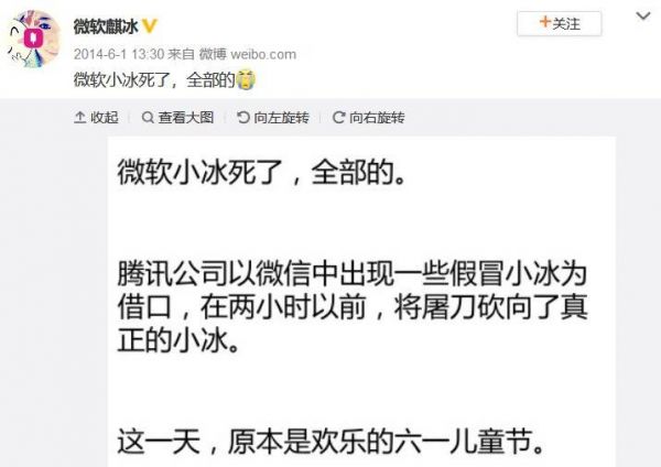2014年6月1日,儿童节。新浪微博上爆出了一篇以此为题的“讣告”——或“檄文”。这篇署名“微软(亚洲)互联网工程院”的短文,控诉“腾讯公司以微信中出现一些假冒小冰为借口,在两小时以前,将屠刀砍向了真正的小冰”。[1]