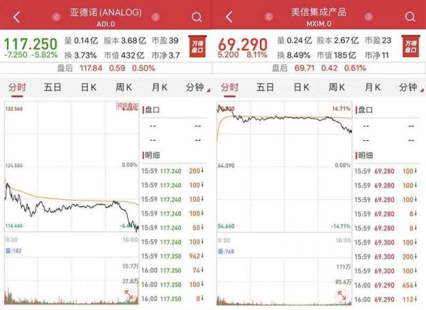 交易公告发布后,ADI盘后股价下跌5.82%至117.25美元,市值432亿美元;Maxim股价上涨8.11%至69.29美元,市值185亿美元。