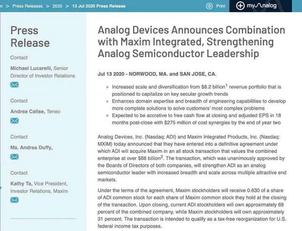 209亿美元:模拟芯片巨头ADI官宣并购Maxim,今年最大并购案诞生