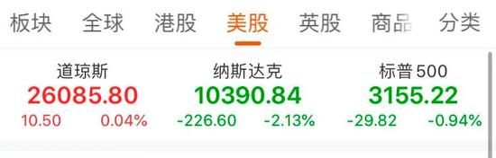 截至收盘,标普500指数收跌0.9%,报3155.22点,日内一度涨超1%;纳指下跌2.1%至10390.84点;道指微涨0.04%,收报26085.8点。