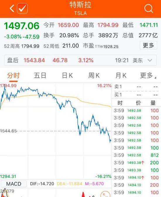 当日,特斯拉股价走势成为市场焦点。该公司股价在创下1794.99美元的历史新高后,收盘回吐此前16%左右的涨幅,且下跌3.1%,收于1497.06美元。