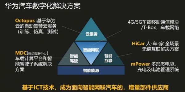 2014年,华为与东风、长安等国内汽车企业展开车联网、智能汽车等业务合作;2015年,与大众共同推进车联网研发应用;2016年,与奥迪、宝马、爱立信、诺基亚、高通、英特尔组建“5G汽车联盟”;2017年,华为海思芯片应用到奔驰、奥迪车上;2018年,发布能支持L4级别自动驾驶能力的计算平台MDC600;2019年1月,发布全球首个支持V2X(车与外界信息交换)及自动驾驶的车载多模5G芯片巴龙5000。