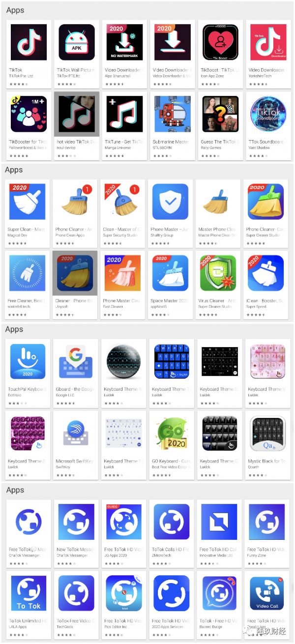 这位开发者还向陆玖财经展示了这样一组实例:图中这多款APP都采用了相似度极高的logo,而他们的功能也是大同小异,普通用户一样看过去很难分辨李逵还是李鬼。而且,在“李逵”被谷歌下架后,“李鬼”还完好活跃在谷歌商店。