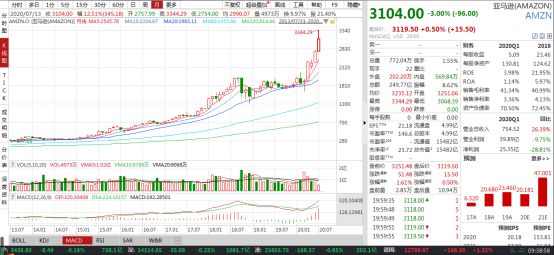 毕竟整体来说,如今的亚马逊股价一路高歌向前,频创新高,虽然截止到周一美股收盘,受大市跳水影响,其股价有所下跌,跌至3104.00美元,最新总市值为15482亿美元,但今年以来其股价累计涨幅超68%以上。