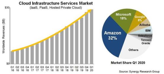 全球云基础建设营收情况以及2020年一季度全球云计算市场份额格局
