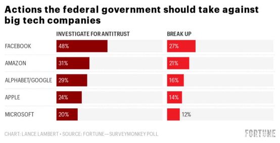根据SurveyMonkey数据显示,今年6月对1276位美国成年人进行了调查,有65%的受访者希望联邦政府对至少一家高科技巨头展开反垄断调查,其中,认为Facebook和亚马逊应该接受调查的呼声比较高,分别占受访者的48%和31%;同时,就分拆高科技巨头方面,有46%受访者希望看到至少一家高科技巨头被分拆;且有11%的人希望分拆亚马逊。