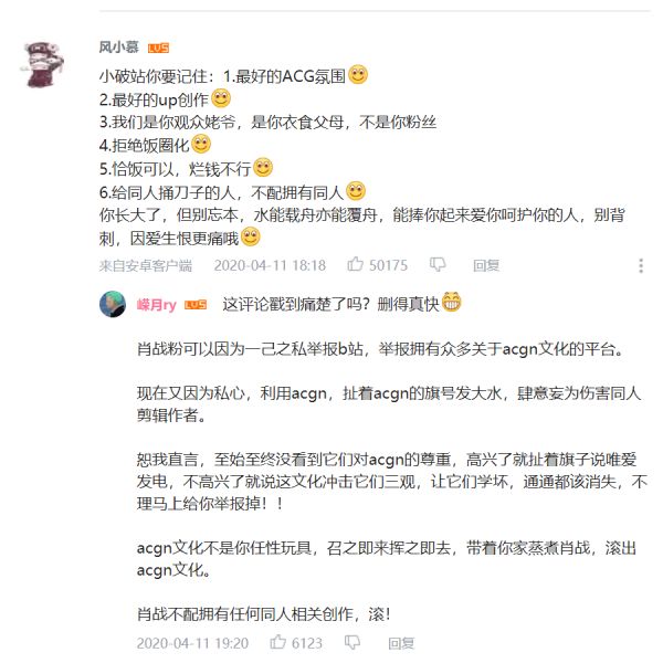 在陈睿,这是破圈过程中必须要付出的代价——如果B站继续年轻,讲给资本市场的盈利故事,将难以支撑,如果B站不想持续年轻必然要开放,二次元用户只剩下叛逃一条路,但B站也将迎来用户和内容的爆发式增长,B站的用户数和内容必然迎来大爆发,毕竟二次元文化对三次元来说,本身就是年轻的代名词,老夫聊发少年狂,这也是为什么《后浪》在B站内也收获了不小的争议,多条用户评论被官方删除。
