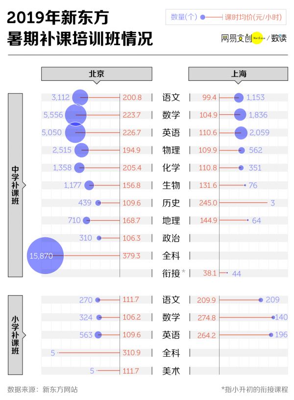 贵,很多家长也愿意买单,而且补一科两科不算什么,补全科才到位。在北京,新东方开设的暑期全科补习班数量高达15870个,因为全科补习基本为一对一上课,所以课时均价也高出不少,均价为379.3元,远远超过单科补习的价格。