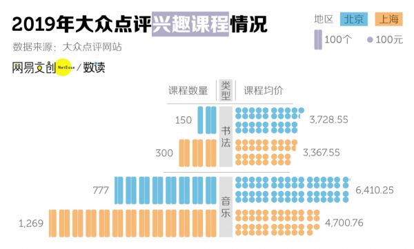 数读菌爬取了“大众点评·学习培训”版块中书法和音乐培训课程的数据,并剔除了点评数不足100的课程和面向成人的课程。可以看到,不管是学书法,还是学乐器,价钱都不便宜。