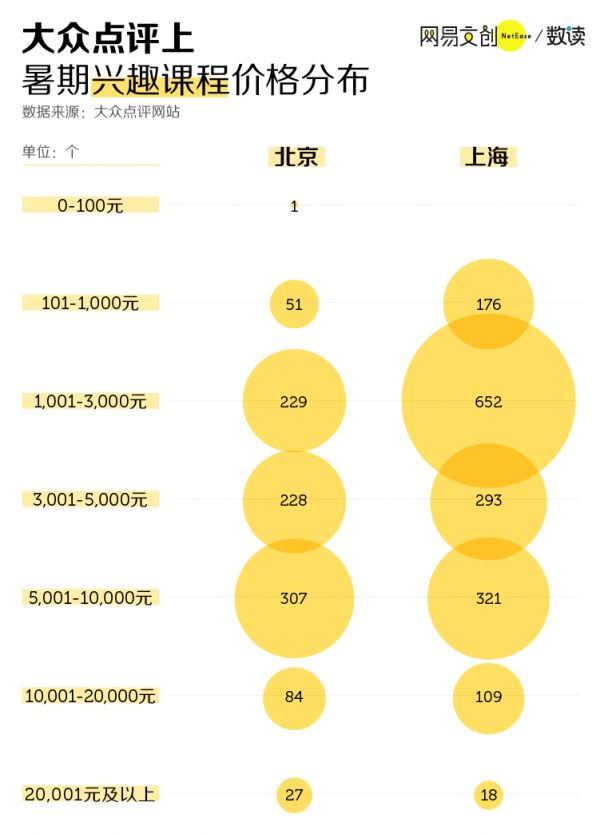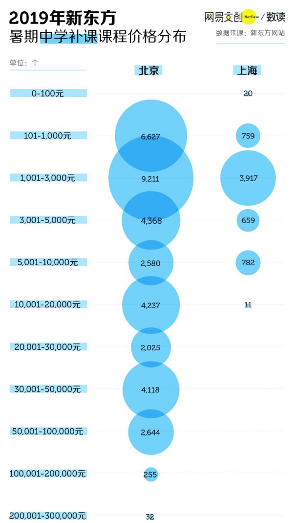 根据统计,新东方在北京和上海开设的暑期中学课程补习班中,1001-3000元的最多。上海的课程相对平价,而北京3万元以上的课程依然很多,甚至有30万元的,全科补习822个小时,再往上还有高达78万元的班。
