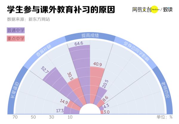北京大学中国教育财政科学研究所发布的《中国新业态发展报告(2017)》也显示,虽然中学生参加补习的原因主要是“查漏补缺”和“提高成绩”,但“长辈逼迫”、“受身边同学影响”的也有不少。[3]