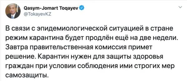 ● 哈萨克斯坦总统7月13日表示,全国隔离期将再延长两个星期 / Twitter