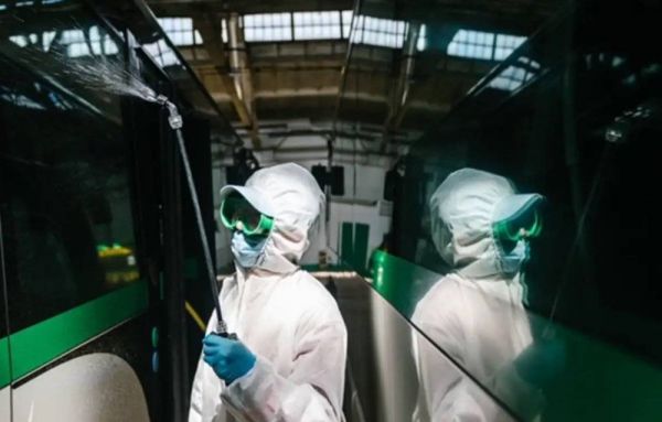 ● 哈萨克斯坦努尔苏丹街头,防护人员在给公交车消毒 / Turar Kazangapov