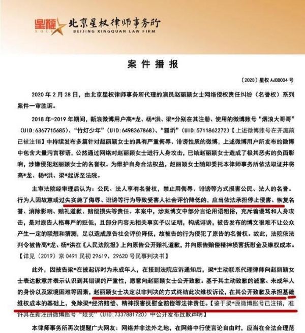 如2月28日,赵丽颖起诉了3名使用污言秽语通过网络对其进行人身攻击的微博用户,但后在起诉时发现其中一名用户是未成年人,且家里非常贫困,于是只要求该用户进行道歉,放弃了上诉赔偿。