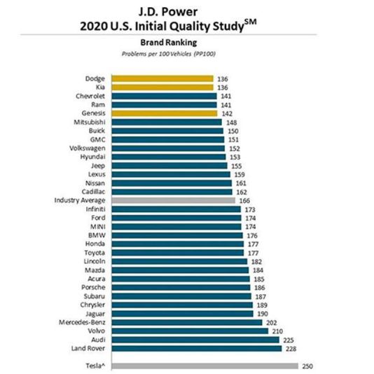 不久前,美国权威汽车咨询公司J.D.Power发布了2020年新车质量调查报告显示,特斯拉在本次的新车质量排名中表现最差,每100辆特斯拉新车就会出现约250个质量相关的问题,也因此在三十多个汽车品牌排名中垫底。