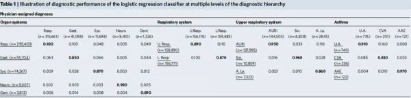 在诊断层级的第一级,分类器能准确地辨别出,大量儿科患者的器官系统之间,存在哪些广泛解剖学分类。接下来诊断层级的第二级,我们拿呼吸系统疾病诊断举例。