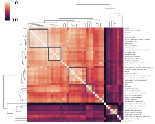 在一些病例中,系统使用相关的ICD-10代码进行聚类诊断,说明具备检测与人类定义的分类系统一致的临床特征的趋势。但是,另一些时候,系统会将相关类型的诊断分为一类,但不包括该类别中的其他非常类似的诊断。比如将“哮喘”和“咳嗽变异性哮喘”分到同一组中,但该类中不包括“急性哮喘恶化”,该病与“急性鼻窦炎”组合在一起。在许多情况下,即使没有任何定向标记或分类系统,系统也成功建立了相关诊断的广泛分组,这表明我们开发的临床特征成功学习了建模和诊断的条件之间的关键的相似性和差异。