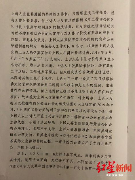 2020年2月,深圳市中级人民法院受理了此案。二审法院认为,上诉人闫先生应当按照劳动合同的约定和公司管理制度的规定,确保每天工作时间8小时。根据被上诉人提交的上诉人确认真实性的上诉人在岗时长统计表,2019年2月、3月上午8点至下午18点期间,上诉人在卡位时长每天3至6小时不等,均不足8小时。