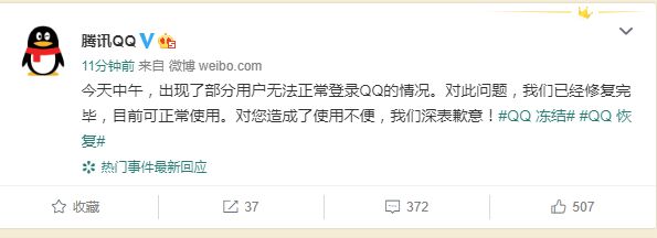 腾讯QQ:中午部分用户无法正常登录 现已修复完毕