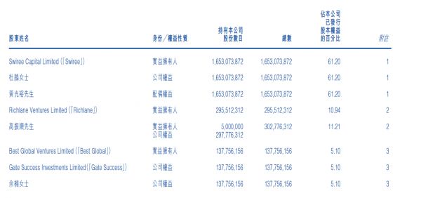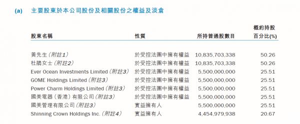 2018年半年报显示,黄光裕妻子为国美金融科技实际控股人,其全资持有的Swiree Capital Limited为国美金融科技第一大股东,持股比例为61.20%。这也就意味着,杜鹃间接持有国美金融科技61.20%的股份。年报指出,因黄光裕为杜鹃配偶,被视为享有同等股份权益。