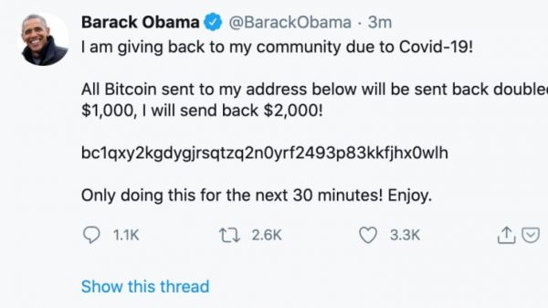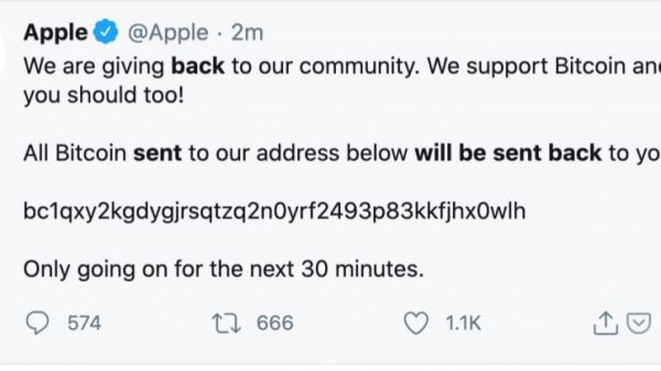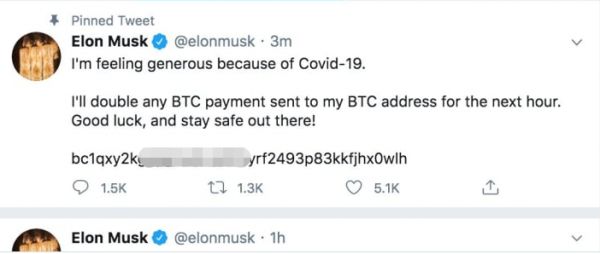 这些账户无一例外都在推广一种加密货币骗局。例如,马斯克的账户曾在周三一早发出一条推文,许诺说任何人只要往一个比特币账户打入1000美元,就会有双倍回报。