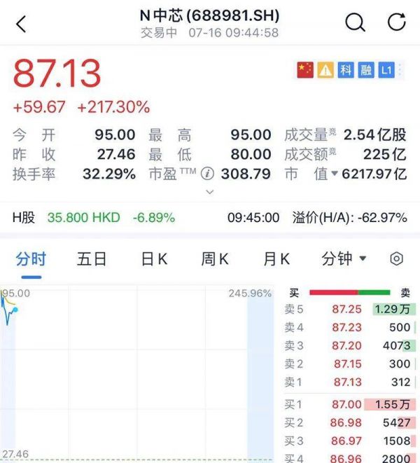 今天上午9点30分,中国大陆半导体行业市值最高公司中芯国际正式登陆A股科创板,按发行价27.46元/股开盘,开盘后股价猛涨245.96%至每股95元,市值飙升至6780亿人民币,随后走势开始过山车式波动,其中跌幅达15%。