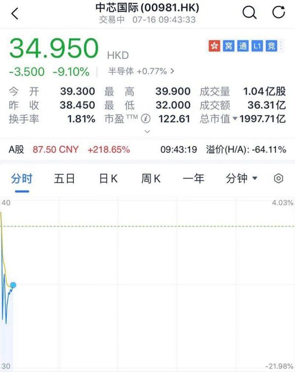 H股方面,中芯国际港股市场短线跳水,跌幅超11%。截止发稿,中芯国际科创板股价为87.13元/股。