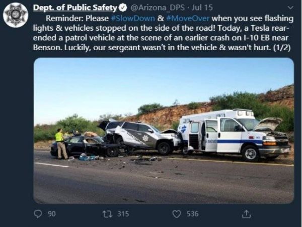随后,亚利桑那州公共安全部发布推文提示:“当看到闪烁的灯光和停在路边的车辆时,请减速且避开!”