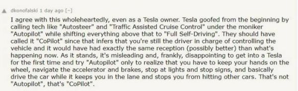 “特斯拉从一开始就做错了,将自动转向(autosteer)、交通辅助巡航控制等技术冠以自动驾驶(Autopilot)之名,同时将这些概念都转换为完全自动驾驶。但正确的叫法应该是副驾驶(CoPilot),因为人类仍然是负责控制车辆的驾驶员。就目前营销方面使用的措辞来说,确实是一种误导。”