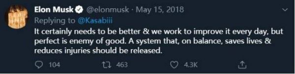 当时,马斯克发推文表示:“(Autopilot)当然需要改进,我们每天都在努力,但完美是良好的敌人。一个总得来说能够挽救生命和减少伤害的系统应该被发布出来。”