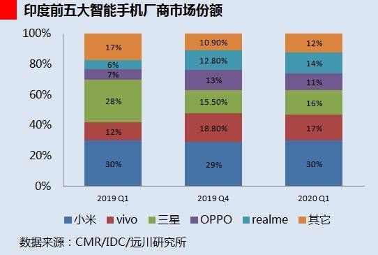 在2019年,vivo完成了一个创举:在印度市场份额上超过三星,市场份额从年初的12%一举上升到了年末的21%。而OPPO和子品牌real me的合计,实际上也远超三星,从年初的合计14%,上升到了年末的20%。