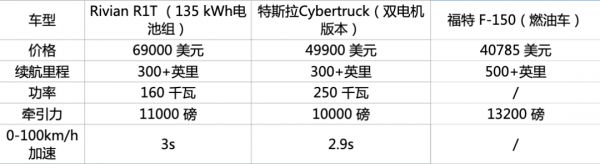 R1T、Cybertruck 与美国销冠 F-150 的部分参数对比 |极客公园制图