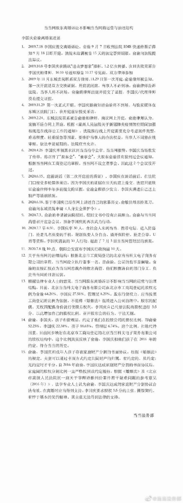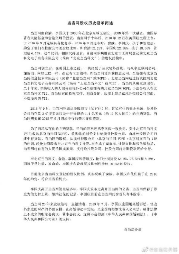 7月16日晚,当当法务部通过官方微博发布了当当网20年股权历史沿革,及李国庆俞渝离婚案进展。称当当网由俞渝、李国庆于2000年在北京东城区创立。当当网创立后、在美国上市之前,一共接受了三次境外投资。