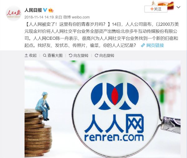 3个月后,人人网被出售给多牛传媒,作价6000万美元(2000万美元现金+4000万美元股份) 。
