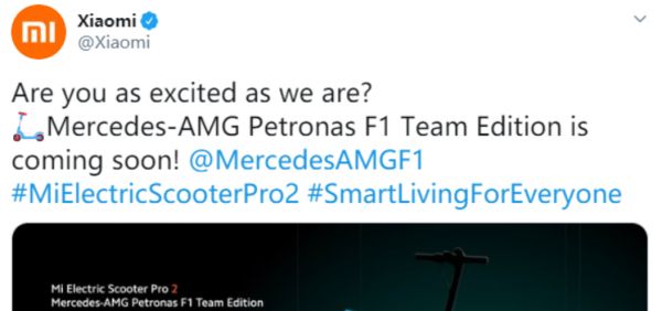 梅赛德斯F1车队亚太区品牌合作副总裁克里斯·丘奇表示:“ 能将梅赛德斯F1的体验带给我们的车友,我们感到十分兴奋。和我们一样,小米致力于不断创新,我们很开心能与他们合作,将他们的旗舰Mi电动滑板车Pro 2的新版本推向市场。”