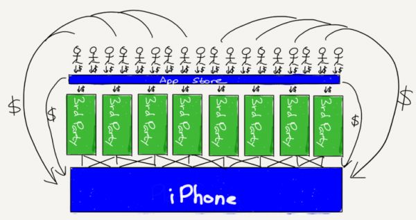 不过,一旦一个平台跌破比尔·盖茨划定的这条界线线,建立在 "平台 "上的企业的长期潜力就会开始下降。以苹果的App Store为例,它拥有平台的绝大多数收益,苹果相当明显地占据了整个生态系统的绝大部分,这既是由于iPhone的盈利能力,也是由于它对App Store的控制;App Store上强势而持久的企业稀少是自然而然的事情。