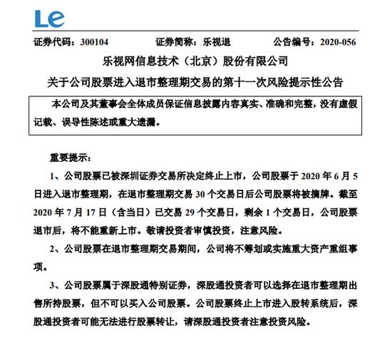 乐视退7月17日晚间公告称,退市整理期已交易29个交易日,剩余1个交易日。