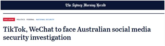 据消息人士透露,莫里森政府将对TikTok等社交平台及微博、微信等主要被华人使用的社交媒体所谓的“安全威胁”进行审查。报道称,这是得到了该国安全机构的建议。