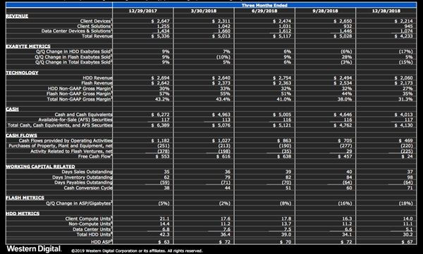 西数2019财年第二财季(时间截至2018年12月28日)的财报显示,非GAAP总营收42亿美元,同比下滑11亿美元。同时,当季净亏损4.87亿美元(约合32.9亿元)。