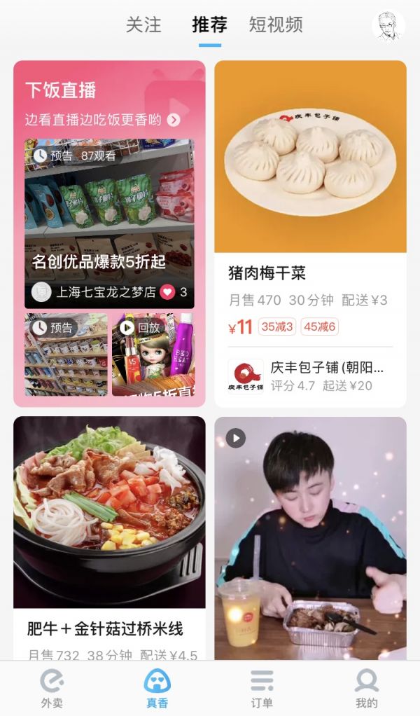 以新版饿了么图文频道“发现”变为全新的短视频内容频道“真香”为例。