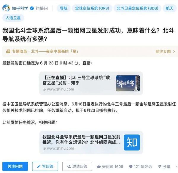 两个月后,北斗全球系统最后一颗组网卫星发射成功。“知乎科学”发布相关问题贴,主动引导用户进行讨论和分析。