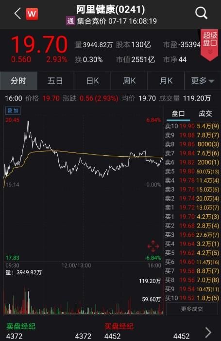 Wind数据显示,阿里健康(HK.0241)最新收盘价为19.70港元/股,总市值2551亿港元。