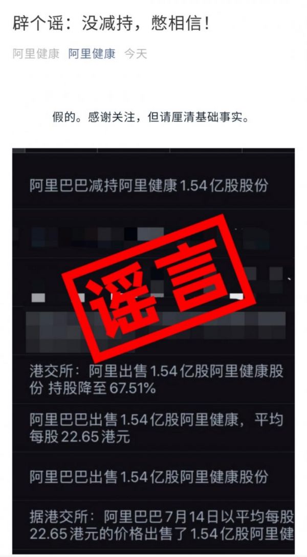 7月18日,阿里健康在微信公众号发文称,假的。感谢关注,但请厘清基础事实。发布消息的同时,一并附上阿里巴巴减持阿里健康1.54亿股股份为谣言的配图。
