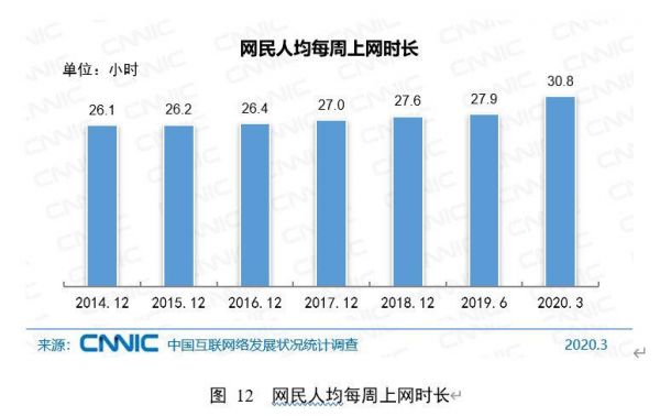 中国互联网络信息中心发布的第45次《中国互联网络发展状况统计报告》显示,截至2020年3月,我国网民人均每周上网时长为30.8小时,即日均上网时长约4.4小时。截至2020年3月,我国手机网民规模打8.97亿,较2018年底增长7992万,我国网民使用手机上网的比例达99.3%,较2018年提升0.7个百分点。