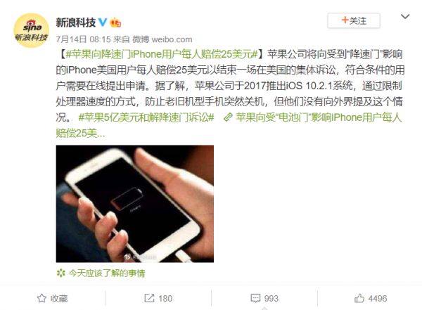 不过,软件方面的电源管理功能也曾引起轩然大波。2017年苹果推出的iOS 10.2.1系统试图通过降频的方式来防止老机型续航严重下滑甚至突然关机,但由于降频严重影响日常使用,苹果于2017年12月遭到美国用户发起的集体诉讼,直至前几天,苹果才就“降速门”事件每位符合条件的用户赔偿25美元。