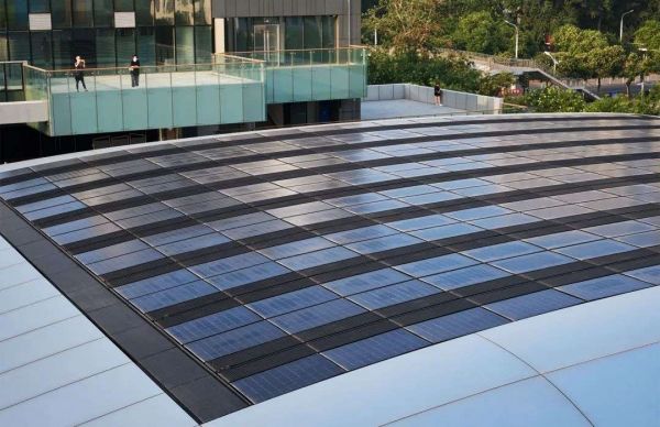 屋顶由大型 3D 不锈钢面板所覆盖。据说新店是苹果在亚太地区第一家采用集成太阳能电池组的零售店,可以为门店提供电力,并且与全球所有苹果设施一样,只采用可再生能源。