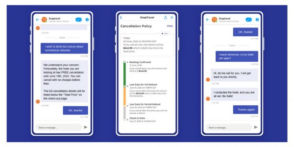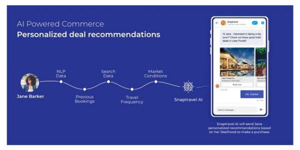 Snaptravel 是一款人工智能酒店预订平台,总部位于加拿大多伦多。公司主要业务是使用对话式 AI 技术帮助用户查找和预定酒店。该平台使用起来非常简单:用户打开 Facebook Messenger 的对话框,与机器人对话,告知其具体地方、时间信息,即可收到自动匹配的酒店选项,同时用户也可以在对话框里完成支付和售后等后续步骤。