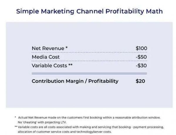 我们使用的衡量标准是「边际贡献(contribution margin)」。我们看的是渠道带来的净收入,即在一个合理的归因窗口内用成交总额减去商品销售成本所获得的实际收入。然后我们减去中间成本和可变成本,剩下的就是边际贡献率或该渠道的盈利能力,如下图所示: