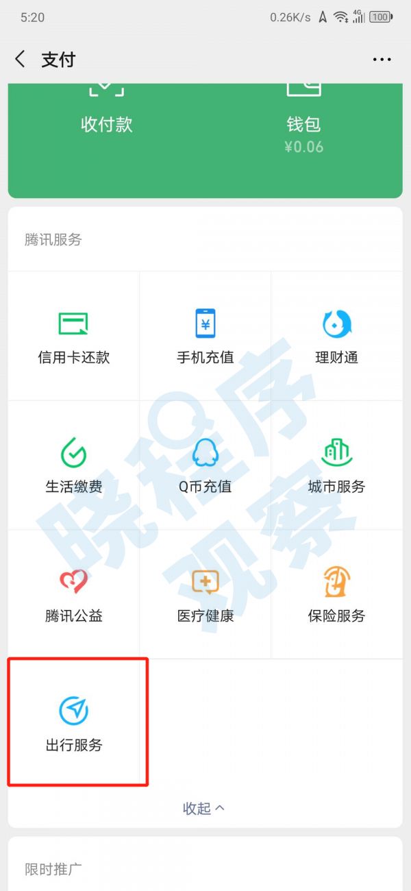 简单的说就是,微信九宫格正在内测试「出行服务」入口。此前微信中就有「腾讯出行服务」小程序,也在深圳小范围内测过,此次九宫格上线的「出行服务」,除了“车生活”和公交两个板块外,又新增了“打车”服务。
